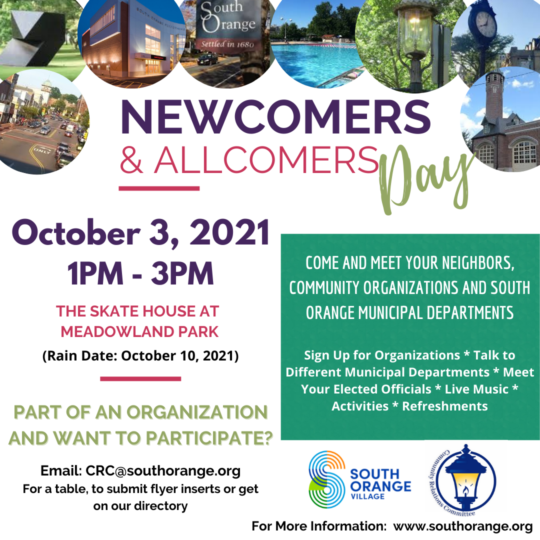 by the Community Police Collaborative Attention all South Orange Residents (old and new)! South Orange Village invites everyone to join them for their annual Newcomers Day on Sunday, October 3rd from 1:00 to 3:00 pm at the Duck Pond in South Orange. You will be able to meet your new and old neighbors, spend time speakingContinue reading “South Orange to Host Newcomers Day on October 3rd – All Residents Welcome”